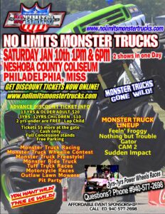 Visit Neshoba on Saturday, January 10, 2026 for the No Limits Monster Truck Show at the Neshoba County Coliseum.